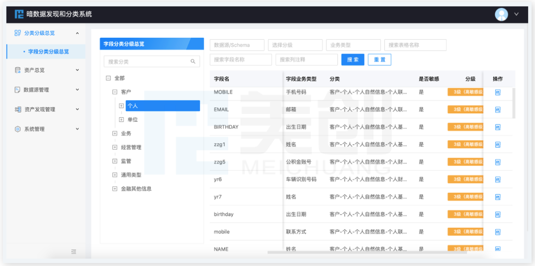实施阶段主要通过美创(暗)数据发现和分类分级系统,实现自定义的数据含义识别和分类分级,并输出发现结果。