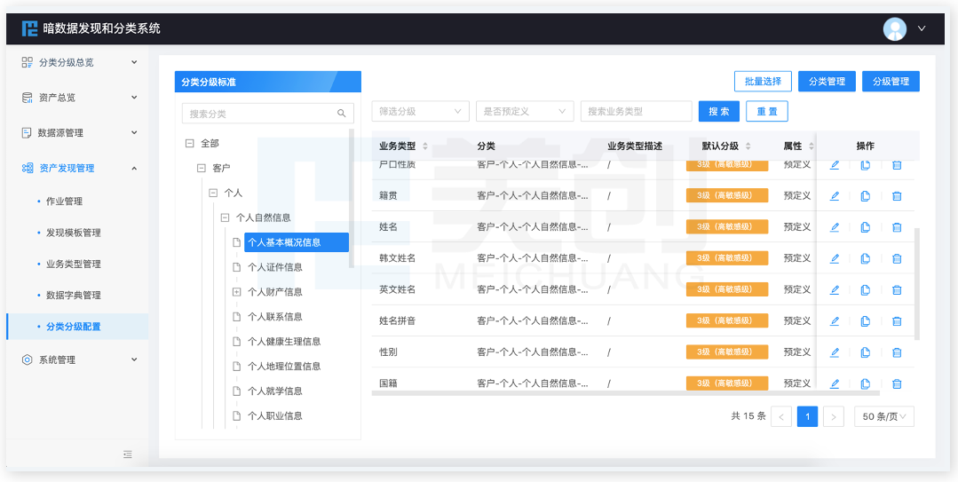 通过不断优化识别效果、调整分类分级模版,以达到全面梳理,策略贴合实际的数据分类分级效果,最终形成资产发现清单,并提供结果导出和接口对接的能力,方便机构将分类分级结果输出到资产管理平台、安全管控平台等,实现数据分类分级的最终落地。
