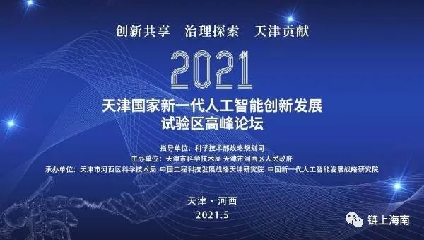 天津国家新一代人工智能创新发展试验区高峰论坛由科学技术部战略规划司指导,由天津市科学技术局,天津市河西区人民政府主办,天津市河西区科学技术局、中国工程科技发展战略天津研究院、中国新一代人工智能发展战略研究院承办。论坛将充分解读天津市人工智能试验区建设行动计划,发布区块链自主创新重大技术成果和天津市人工智能试验区十大典型应用场景,探讨人工智能技术的创新能力和规模化应用落地能力,探索人工智能健康发展新路径。
