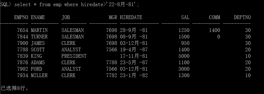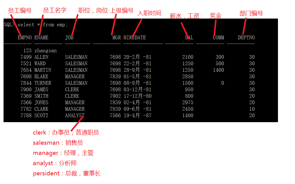 查询emp表的员工信息,并且让结构显示为“ename担任的 job职务”
