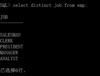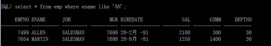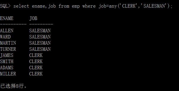 Select ename,job from emp where job = any(‘CLERK’,’SALESMAN’);