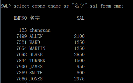 Select empno “编号”,enameas “名字”,salfrom emp;
