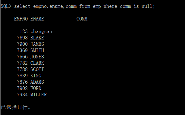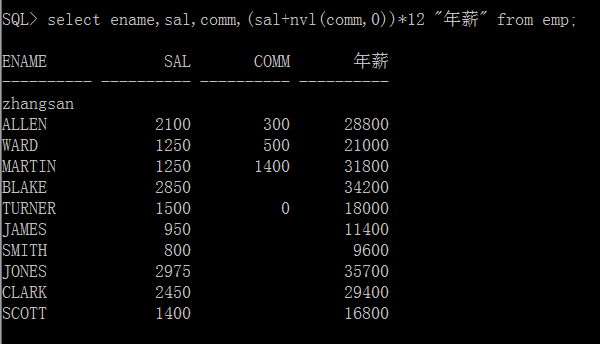 结果:没有奖金的人年薪也没有,因为在oracle中任何数据和null数据运算的结构都是null。