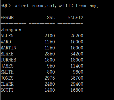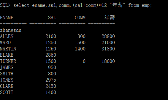 Select ename,sal,comm,(sal+comm) *12 “年薪”From emp;