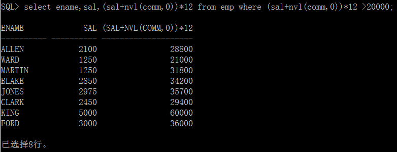Select ename,sal ,(sal+nvl(comm,0))*12 from emp where(sal+nvl(comm,0))*12 > 20000;