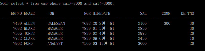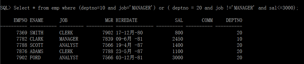 select * from emp where (deptno=10 and job=’MANAGER’) or ( deptno= 20 and job !=’MANAGER’ and sal<=3000);