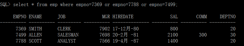 方法一:Select* from emp where empno=7369 or empno=7499 or empno=7788;