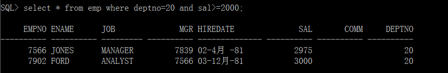 查询emp表中20号部门中工资高于或者等于2000的员工信息
