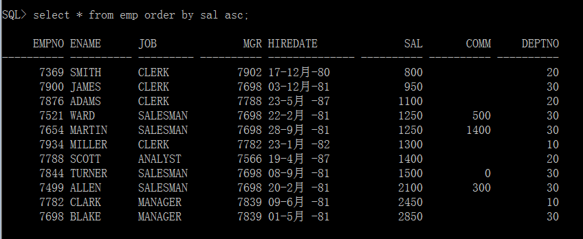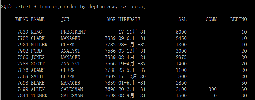 2.查询emp表中员工的信息,并按照部门从小到大,在部门内按照工资从大到小排序。