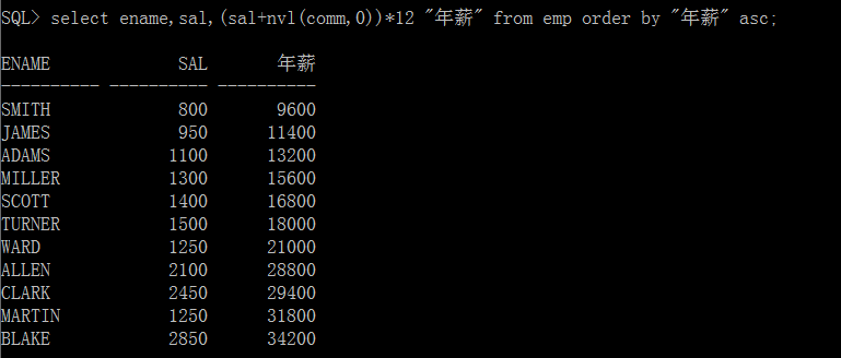 Select ename,sal,(sal + nvl(comm,0))*12 as “年薪”from emp order by “年薪”asc;
