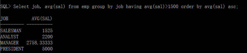 Select job, avg(sal) from emp group byjob having avg(sal)>1500order by avg(sal) asc;