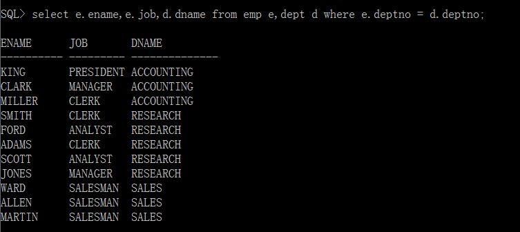 Select ename,job,dname from emp,dept whereemp.deptno = dept.deptno;