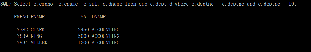 Select e.empno, e.ename, e.sal, d.dname fromemp e,dept d where e.deptno = d.deptno and e.deptno = 10;