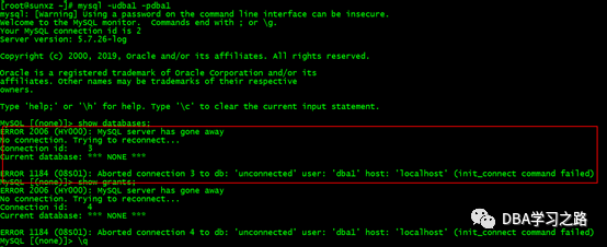 不然得出:执行init_connect中的语句失败了,会出现这个问题,且会校验该用户是否有super权限,如果有,则跳过执行