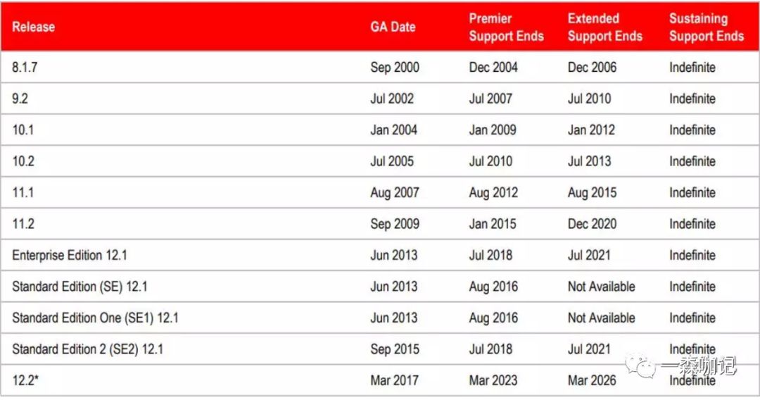3. 18c Release Family 12.2 的Premier Support Ends (PS)截止日期为:20-Nov-2020 for Patching,31-Mar-2023 for all other Support Offerings;