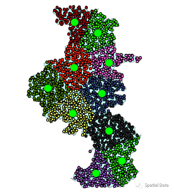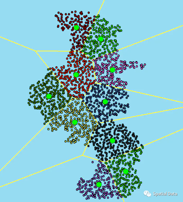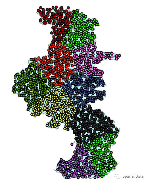 使用ST_ClusterKMeans均值中心聚类分析,把散点聚簇分类。