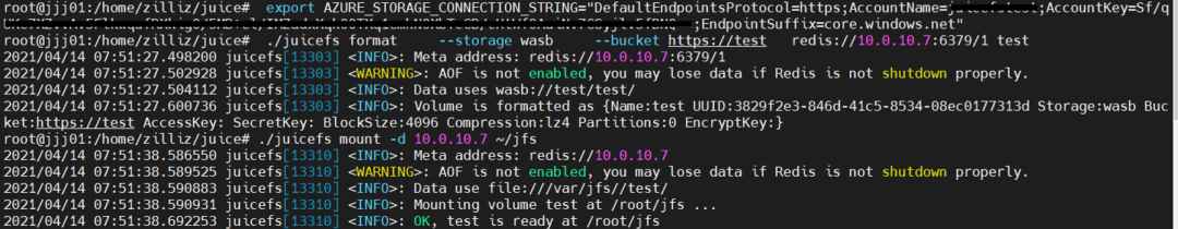 $ export AZURE_STORAGE_CONNECTION_STRING="DefaultEndpointsProtocol=https;AccountName=XXX;AccountKey=XXX;EndpointSuffix=core.windows.net"$ ./juicefs format \--storage wasb \--bucket https://<container> \... \localhost test #格式化$ ./juicefs mount -d localhost ~/jfs #挂载