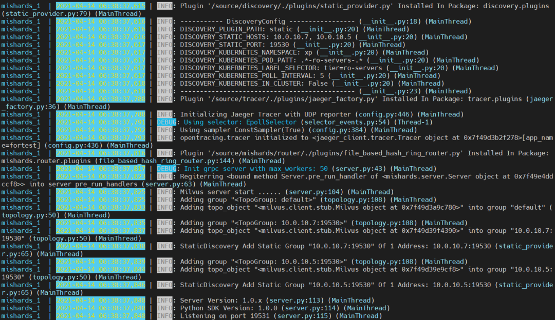 最后,参考 GitHub 中教程【6】,在集群中任意一台设备上启动 Mishards 服务。下图表示 Mishards 启动成功。
