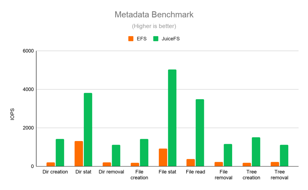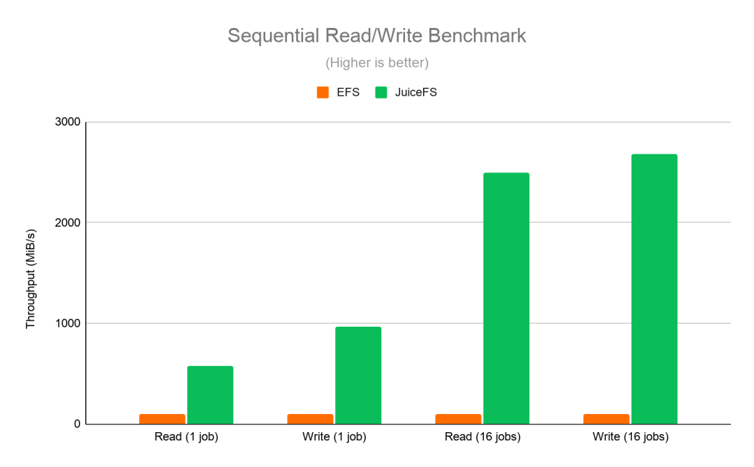 区别于传统的 NAS 系统,JuiceFS 基于 Filesystem in Userspace(FUSE)实现,数据读写都直接发生在应用端,因此能进一步降低访问延迟。此外,JuiceFS 还提供一些 NAS 系统不具备的特性,如数据压缩、数据缓存等,性能也有大幅提升。在与 EFS 的对比测试中,JuiceFS 表现出了较大优势。如图 1 所示,在原数据操作性能上,JuiceFS 的表现明显优于 EFS,差距最大时 JuiceFS 的性能可优于 EFS 十倍之多。图 2 记录了在顺序写与顺序读测试中 JuiceFS 与 EFS 的 I/O 吞吐性能数据:无论在单任务或是多任务的测试中,JuiceFS 相比 EFS 都有较大的性能提升。