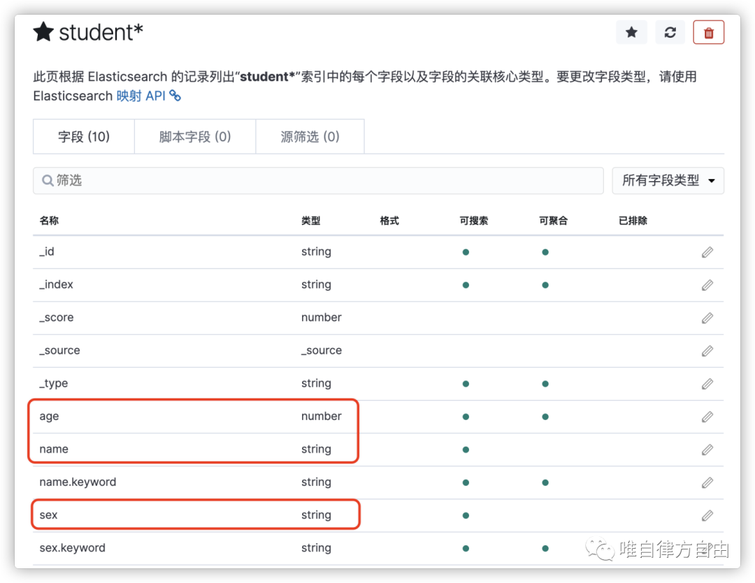 ES 的字段(Field)类型是自动创建的,比如会给 name 字段自定义为 string 类型,下图是在 Kibana 上创建索引模式之后可以方便看出该类索引的 Field 数据类型: