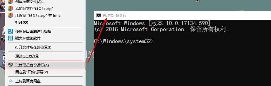以管理员身份打开命令行(如下图所示),一定要是管理员身份,否则由于后续部分命令需要权限,出现错误!
