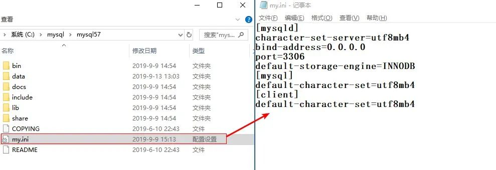 ③在mysql目录下创建一个ini或cnf配置文件,在这里我创建的是ini配置文件,里面写的代码是mysql的一些基本配置