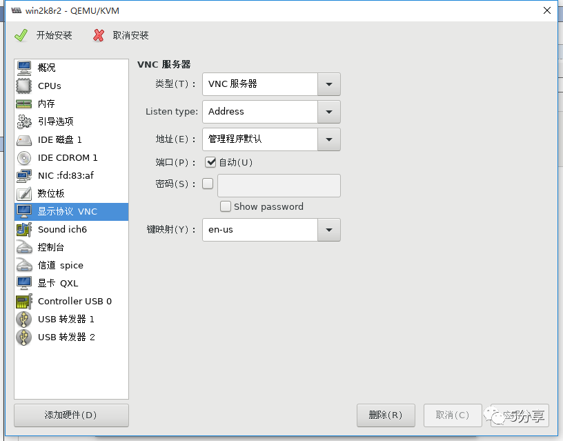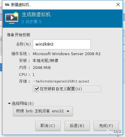 [root@localhost ~]# virt-install --virt-type kvm --name centos --ram 1024 \--disk /data/kvmstorage/centos7.qcow2,format=qcow2 \--network bridge=br0 \--graphics vnc,listen=0.0.0.0 --noautoconsole \--os-type=linux --os-variant=rhel7 \--location=/data/iso/CentOS-7-x86_64-Minimal-1804.iso[root@localhost ~]# virsh list --allId 名称 状态----------------------------------------------------5 win2k8r2 running7 centos running