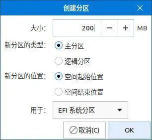 3、自动分区时,需要创建第一个分区为 EFI 系统分区(建议 200M),再创建一个挂载点为/ (根分区)的分区: