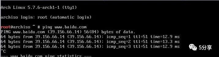 测试下网络通不通,安装Arch linux必须能上网。