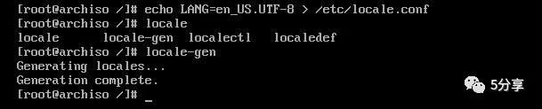 echo LANG=en_US.UTF-8 > /etc/locale.conflocale-gen