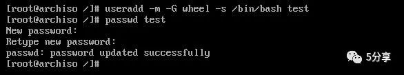useradd -m -G wheel -s /bin/bash testpasswd test