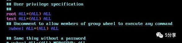 为新用户添加管理员权限,将文件/etc/sudoers中的wheel ALL=(ALL) ALL那一行前面的注释去掉。