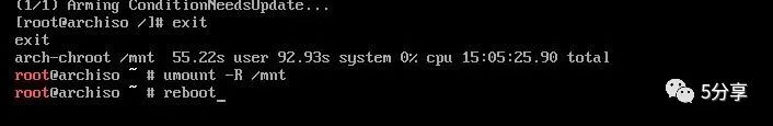 exit 退出当前环境umount -R /mnt 卸载分区reboot 重启