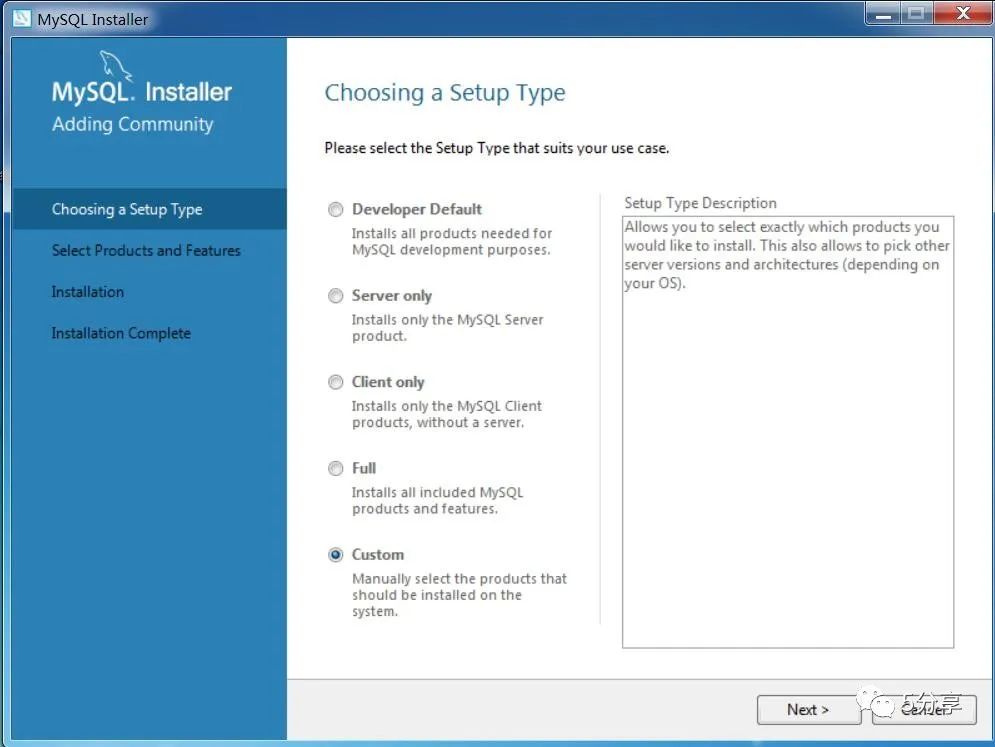 点击MYSQL安装文件,选择【custom】