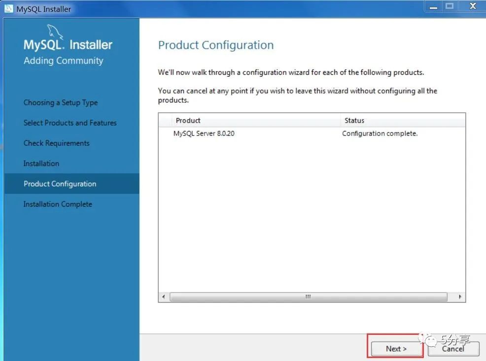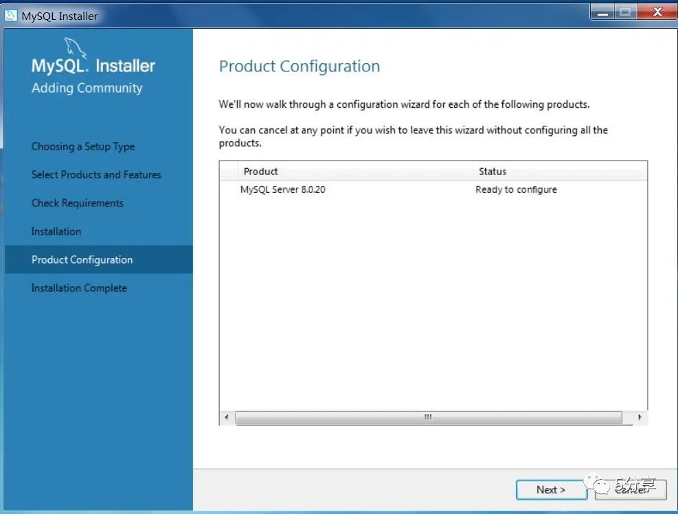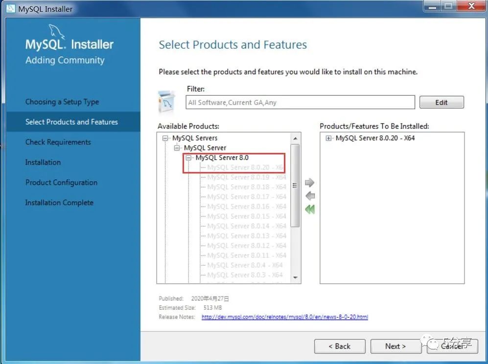 将MySQL 8.0.20移动到右边,点击【next】