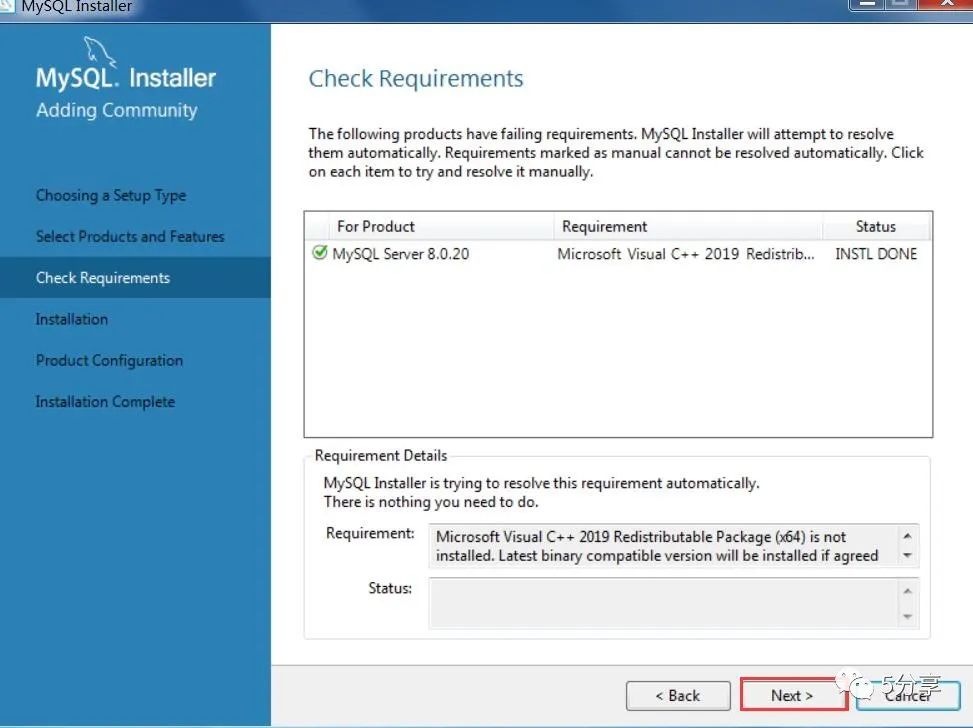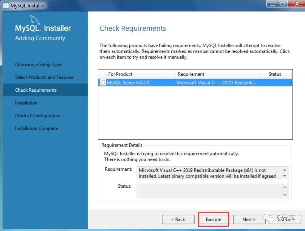 安装Mysql8.0.20需要安装VC++2019,如果没有安装点击【Execute】联网自动安装VC。