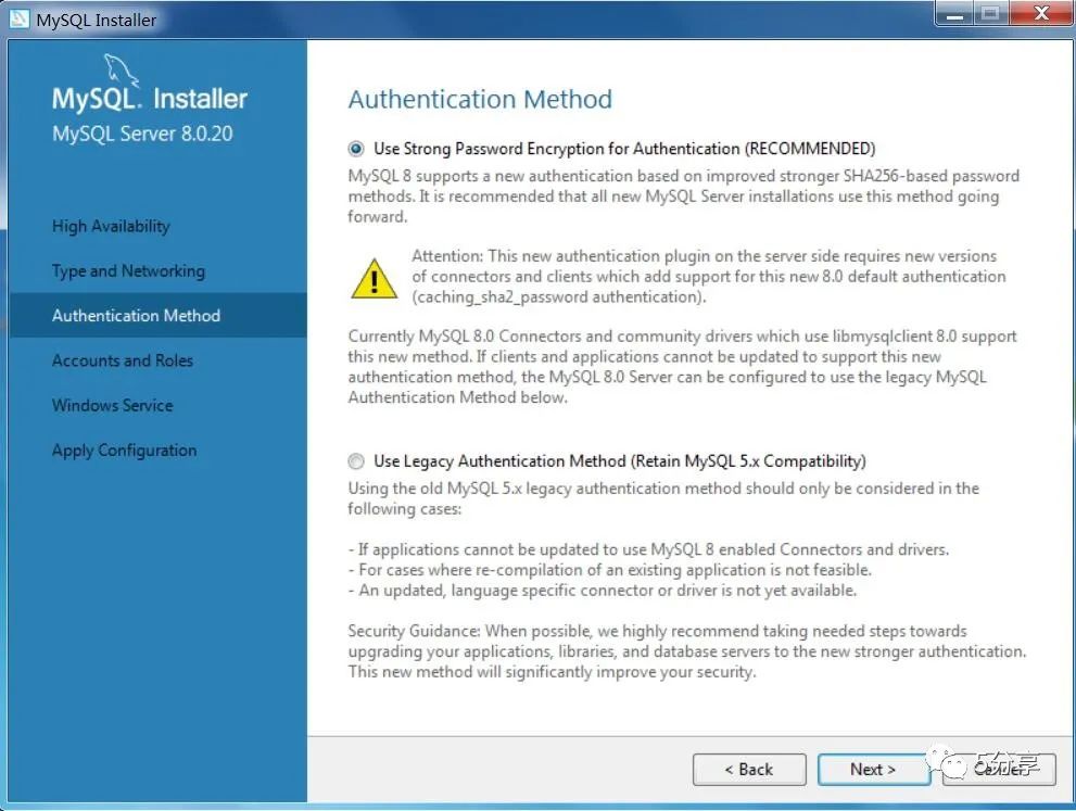 第一个是使用强密码加密授权(推荐),第二个是传统授权方法(保留5.x版本兼容性),选择第一个后续可能客户端连数据库报错,原因是mysql8 之前的版本中加密规则是mysql_native_password,而在mysql8之后加密规则是caching_sha2_password,我建议如果是学习选择第二种,这次安装我没注意默认选择的第一种。