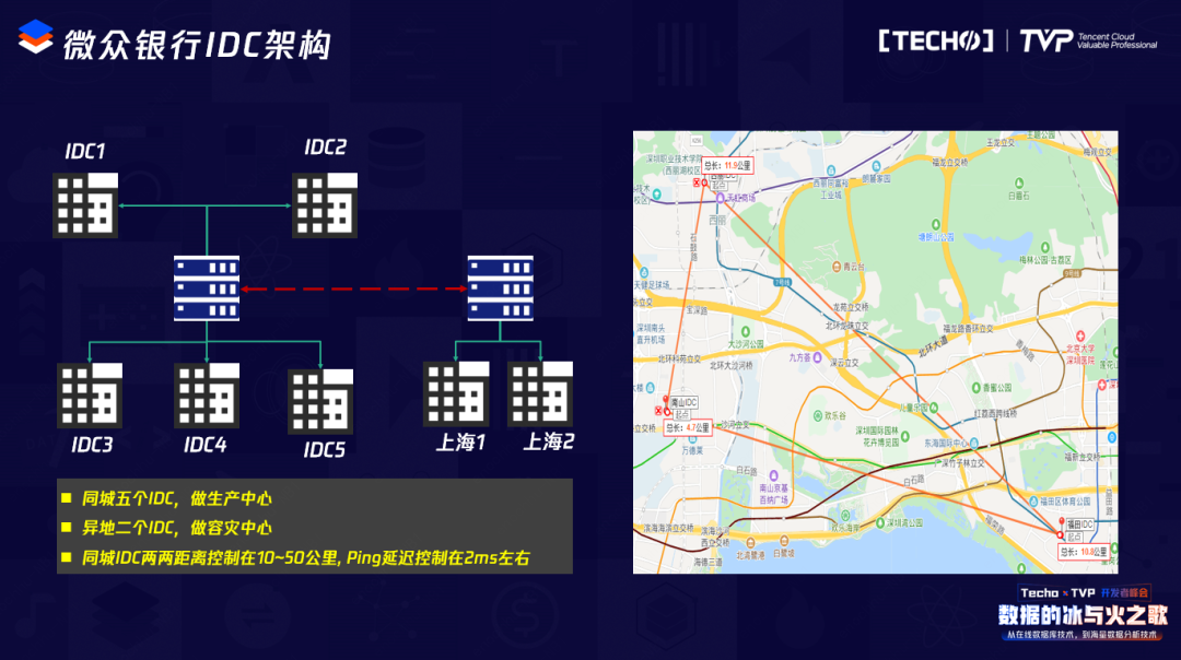 微众银行现在IDC的建设,是2地7中心的IDC架构,我们在深圳有5个生产机房作为生产中心,在上海有2个容灾机房作为容灾中心。我们在深圳同城的这5个机房选址也是有规定的,两两IDC的距离控制在10-50公里的范围内,以此来保证IDC之间的网络延迟在2毫秒左右,这是数据库多副本跨同城IDC部署的前提。