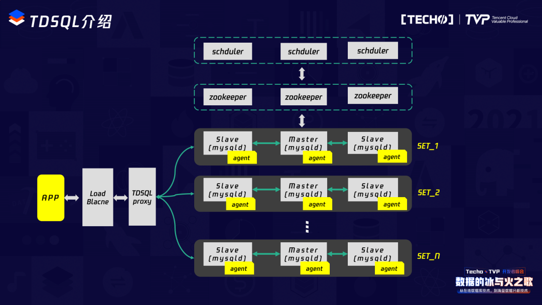 再看纵向维度。可以持到纵向维度上,TDSQL还有两个比较关键的模块,一个是zookeeper,它是整个TDSQL配置的管理系统,所有的元数据信息和监控上报的统计信息,都会上报到zookeeper集群。在zookeeper之上还有一个模块叫schduler,它负责整个TDSQL任务流程调度,比如SET1现在Master节点可能宕机了,需要做一个主备切换,这个主备切换的流程就是由整个schduler模块去调度的,它会控制每一步切换的流程,直到最终切换成功。