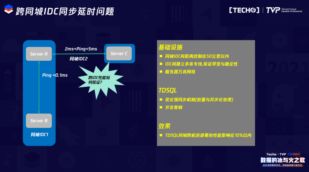 大家可能会有一个疑问:同城的一主两备是分布在三个机房之间的,机房和机房之间可能会有延迟,我们是控制在两毫秒内,但对性能会不会有什么影响?首先我们在基础设施方面,在机房建设上会设定一些原则,刚才也提到同城IDC的距离控制在50公里之内,IDC之间会建立多条专线,保证带宽和稳定性。我们现在全部都是万兆网络的基础设施,这是硬件层面的保证。另外软件层面是针对TDSQL,TDSQL本身对于这种主备之间的强同步机制做了一些异步化和批量化的性能优化,来保证跨机房强同步的性能损失尽量控制在10%以内。