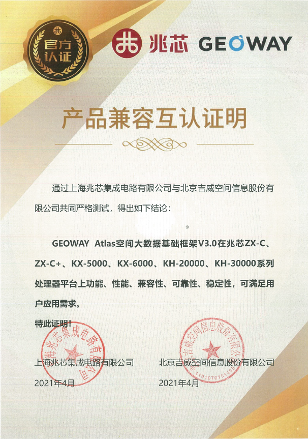 北京吉威空间信息股份有限公司长期致力于地理信息技术与遥感的创新研发,近期,兆芯国产通用处理器与吉威公司开发的GEOWAY Atlas空间大数据框架正式达成产品兼容互认证明。
