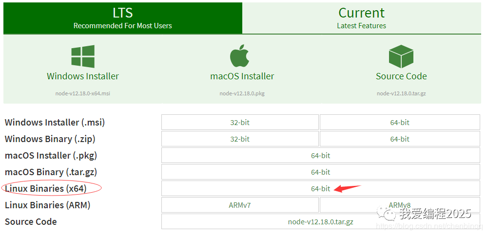 进入nodejs的下载页面,点击如下图箭头指示的Linux 64-bit https://nodejs.org/en/download/