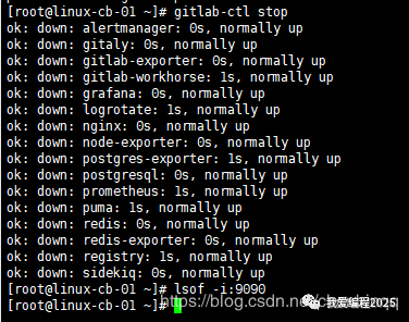 从上图可以看出,gitlab的相关进程在9090端口,此时,我们先将gitlab服务停掉,保证Yapi的成功安装,后续再处理端口冲突的问题,将Yapi的端口尝试修改为其它未被占用的。