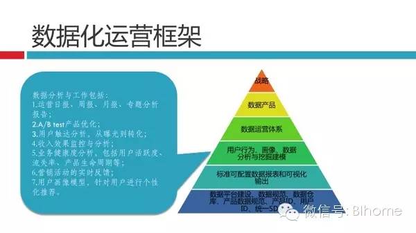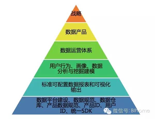 从BAT的数据化运营体系可以归结为六个层级,围绕数据平台建设的:数据规范、数据仓库、产品数据规范、产品ID、用户ID和统一SDK;围绕数据报表可视化的输出,包括数据地图、数据门户;对数据进行的精细化加工,关于用户的画像、行为、特征加工分析和挖掘;结合具体的应用场景的数据运营体系,在阿里妈妈做广告推荐,在微信做公众号、朋友圈推荐,在搜索关键词做SEM推荐;围绕数据和应用,所展开的各类数据产品;通过数据影响到战略分析和决策。