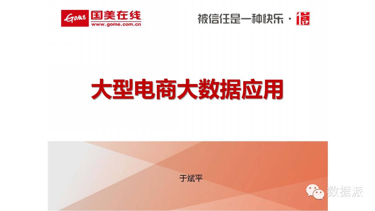 于斌平:大家上午好,很高兴代表大型电商企业来跟大家分享一些大数据在电商企业的应用案例。刚刚过去的双11,我们国美在线在大数据的支持下业绩增长非常好,同比增长4倍多,电商行业排名跃升到第三。在双11的时候,很多友商搞的很热闹,国美是稳健的往前走,我们踏踏实实的把事情做好,给消费者提供最需要的质量最好的产品,最实惠的价格,最快的物流配送服务。