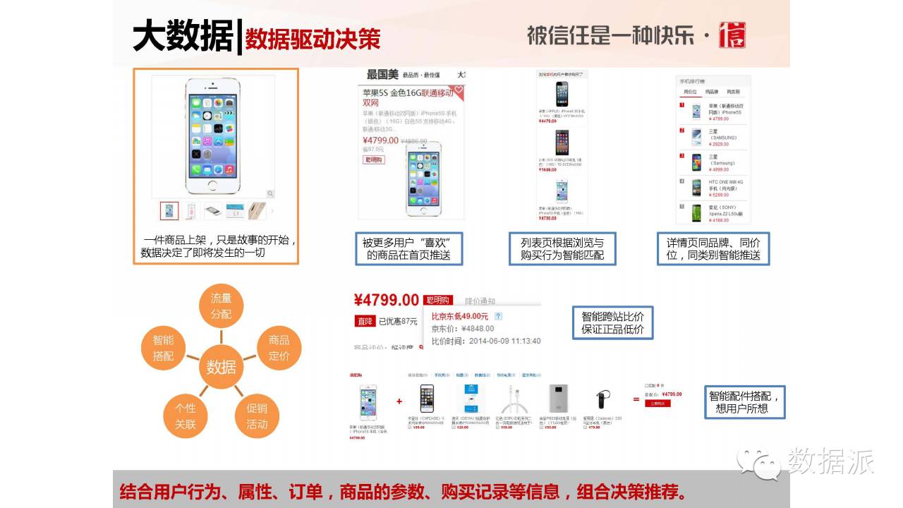 第二,列表页。你看到一个手机,展现出来以后能跟哪些商品组合放在一起,旁边放什么,下边放什么,鼠标悬停3秒后旁边又推荐出什么商品,后面都是大数据的实时计算在支撑。我们都知道传统的啤酒加尿布原理,但现在超市里面啤酒和尿布已经不放在一起了,他中间隔的远一点,顾客买了啤酒找尿布的时候可以顺便买别的东西。电商不能这么做,否则顾客在找东西的过程中可能就流失了。我们在最短的时间内,算出顾客可能想要和需要的商品,并把他们及时呈现在顾客面前。