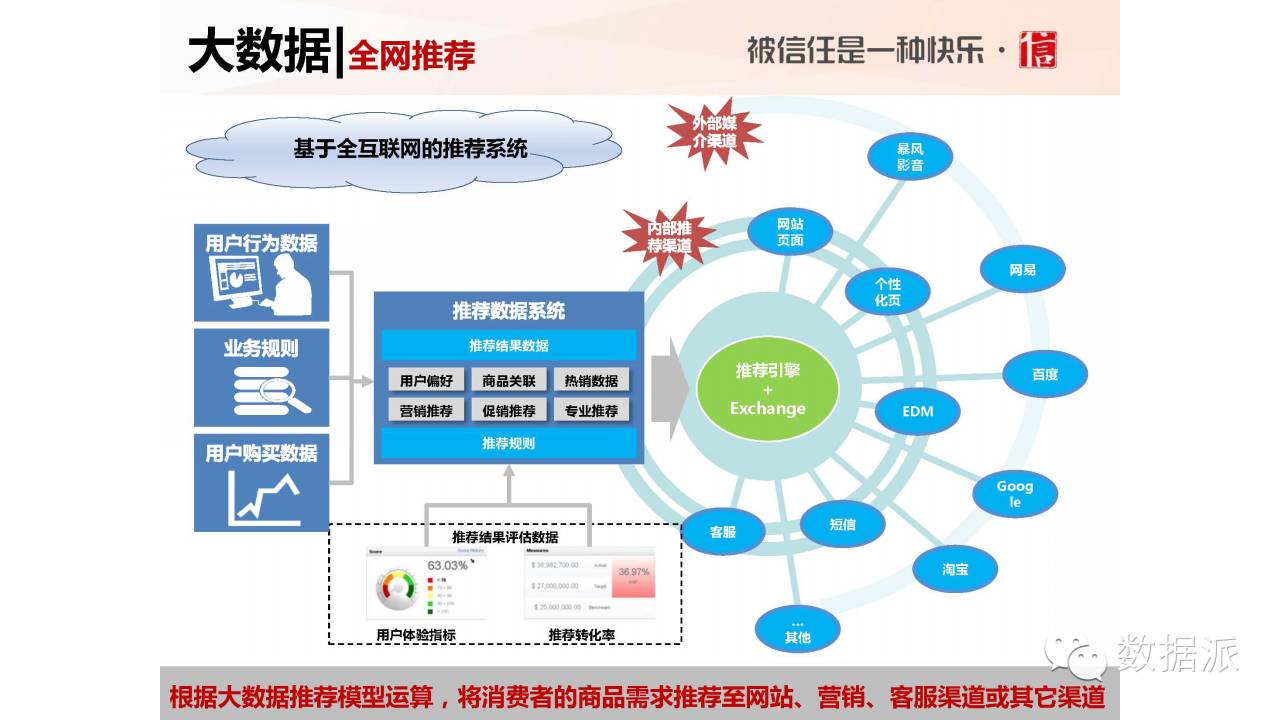 还有一个全网推荐的例子,我们根据分析把用户的喜好、相互关联的商品都推荐出来。你在国美在线上看到一个什么品牌的手机,去其他门户网站你发现他又给你推荐相同的。还有很多笑话,有些人不小心看其他的商品,到不相关的网站上发现老是给推荐这个商品,因为你以前老是在浏览这个商品。