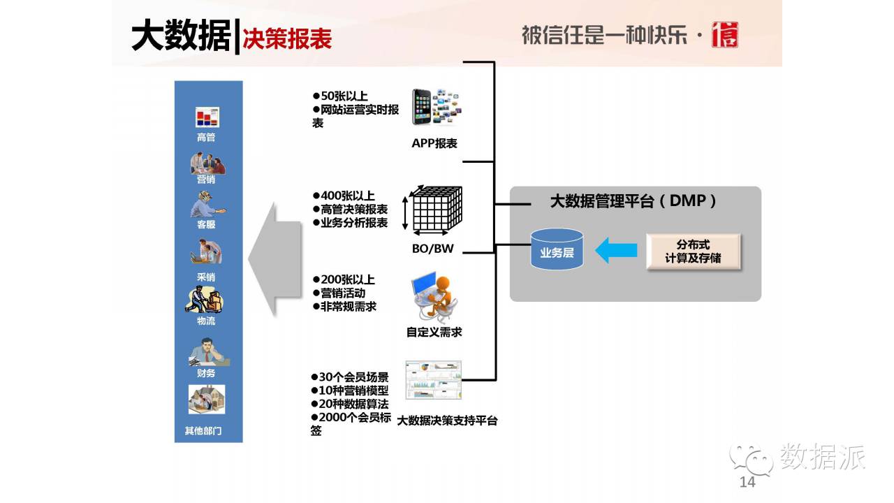 大数据很多,最终你要展现成报表给业务人员看。我们做了很多实时的报表,还有一些实时的分析都在手机上,所有的业务,这个商品好和不好,报表上马上能看出来。