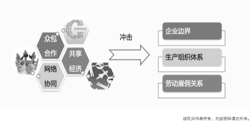 阿里巴巴研究的研究显示,“互联网+”时代大规模社会化协同将是最重要的特征,其中包含共享经济、网络协同和众包合作三个方面,而这种特征将迫使企业重新调整组织边界、生产组织关系和劳动雇佣关系。