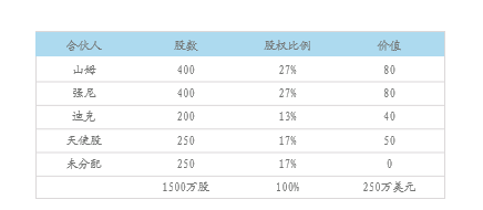 在亚平投资后(的那一瞬间),该公司的内部估计已经从两百万增加到二百五十万,以每股二十美分计算,所有股东的股票只占到1250万股(250万/0.2=1250万)。那么为什么会多出来250万股,它们并没有相应的资金或者技术做抵押,这些股票的存在实际上稀释了(Dilute)所有股东的股权。为什么公司自己要印这些空头钞票呢?因为它们必须留出来给下面的用途: